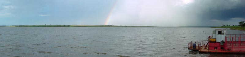 Vista del lago Yguazú Un día de chaparrones, a la derecha (al lado de la balsa) está lloviendo, a la izquierda brilla el sol, y en el medio, el arco iris.
